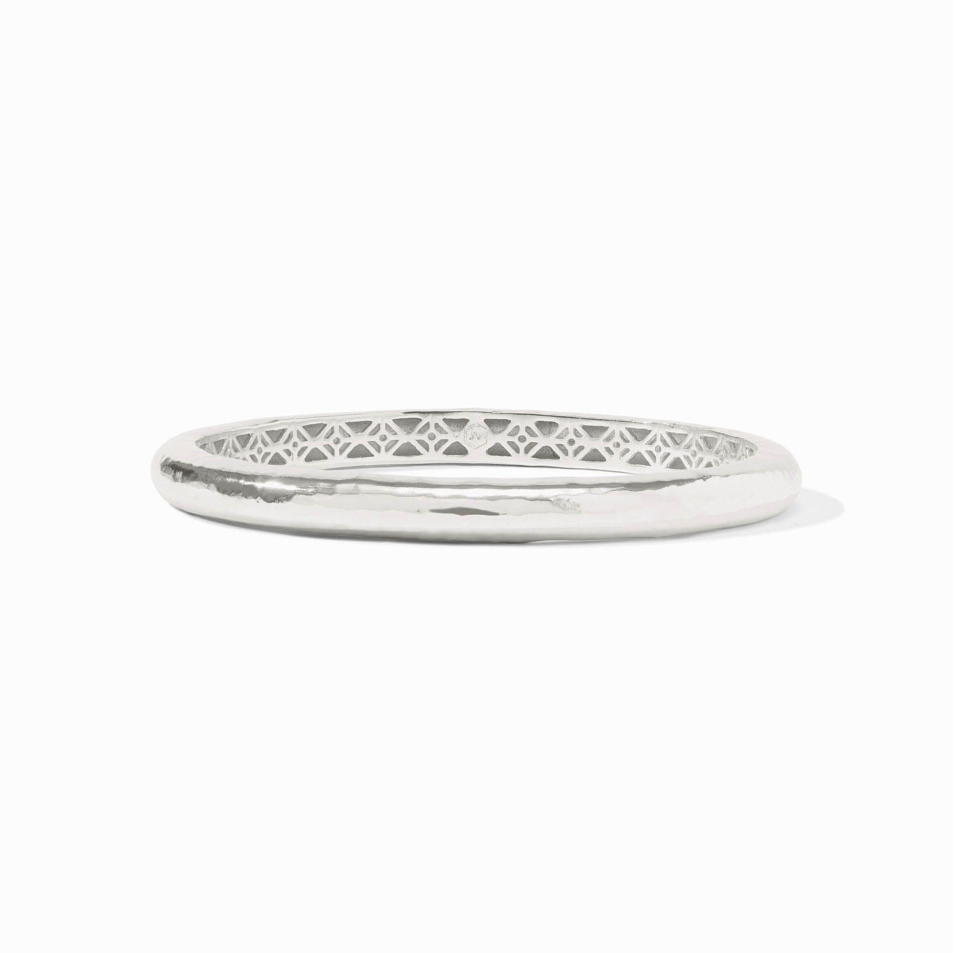 Elegant yet simple, this bangle features a lightly hand-hammered finish. An ornately geometric pierce work interior adds lightness and luxury for wearing stacked or solo.