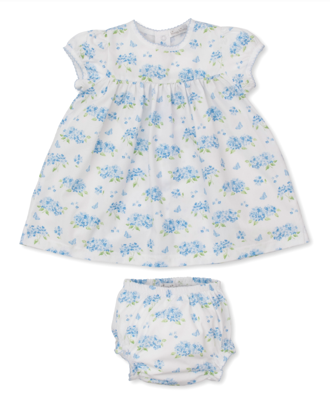 Our adorable blue heavenly hydrangeas print patterns this woven baby dress set, complete with a diaper cover. Made from 100% Pima cotton for a soft and comfortable fit.