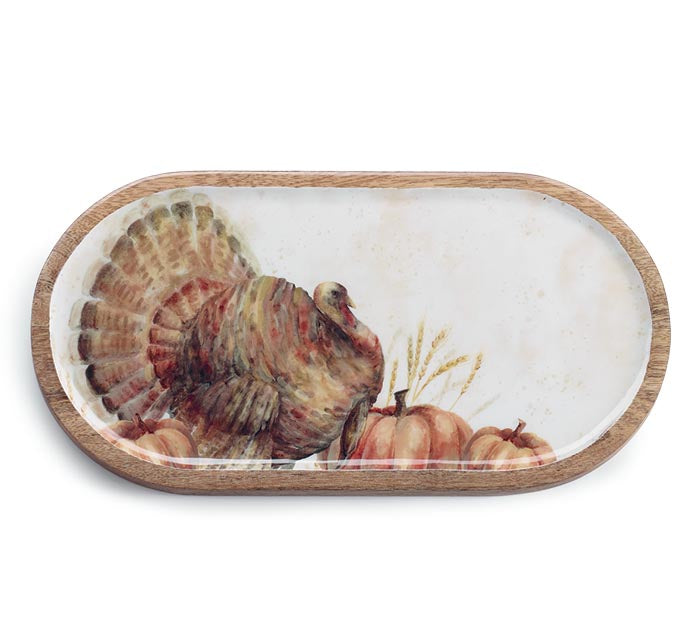 Mango wood tray with a cream background and turkey in the middle with pumpkin artwork.
