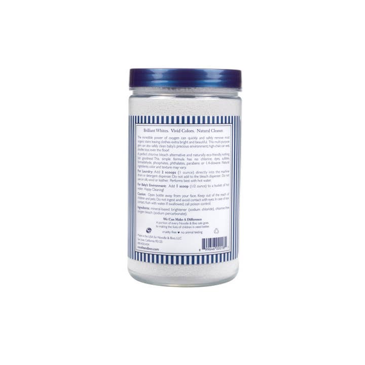 Safely clean baby’s precious environment; high-chair, stroller, toys; even the floor! The incredible power of oxygen can quickly and safely remove most organic stains. A perfect chlorine bleach alternative and naturally eco-friendly; nothing but goodness! This simple, fragrance-free formula has no chlorine, dyes, sulfates, formaldehyde, phosphates, phthalates, parabens, or 1.4-dioxane. Highly concentrated (32 washes). 32 ounce jar; scoop provided. Hypoallergenic Pediatrician-tested Dermatologist-tested Cruelty-free Non-toxic Made in USA