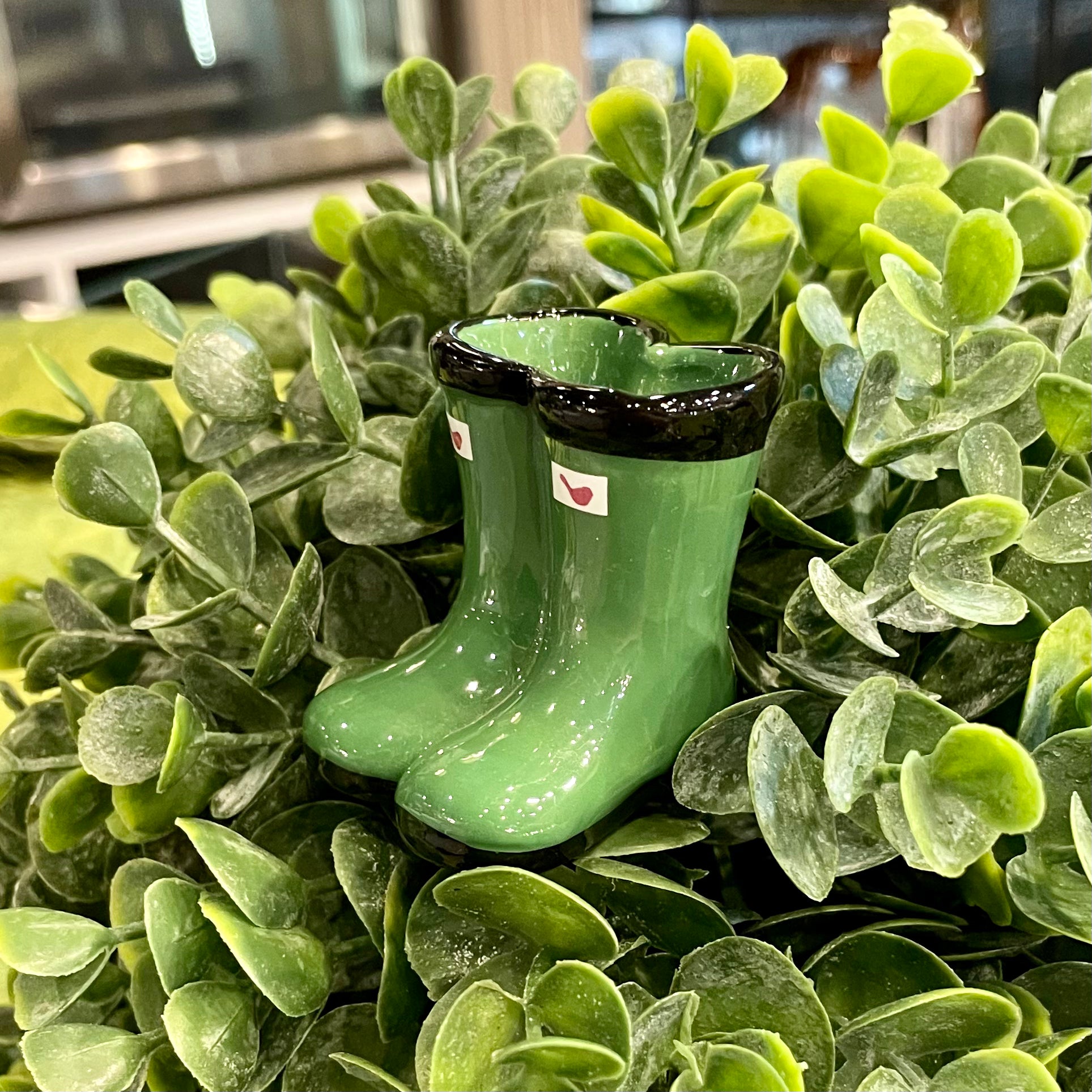 It might be raining outside, but your home will feel nice and cozy with the Nora Fleming Galoshes Mini! This adorable green rain boot mini is perfect for summer.
