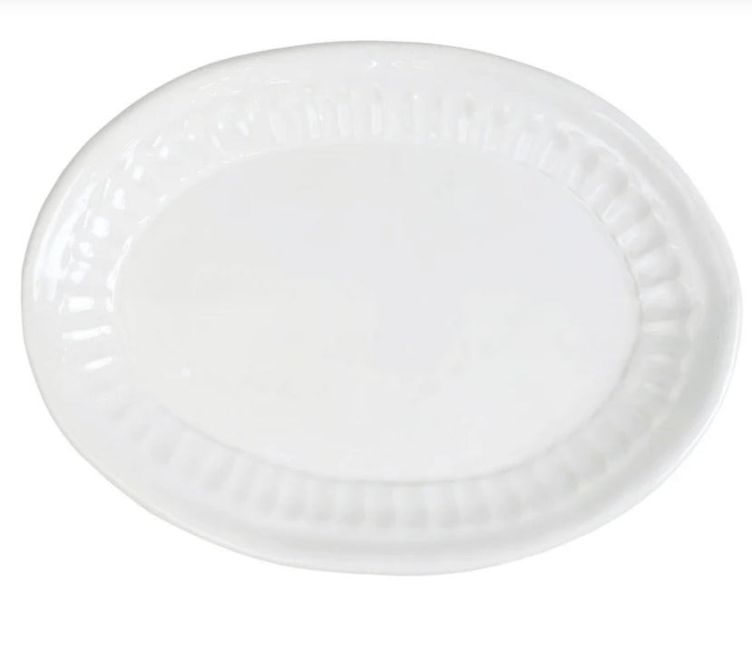 Pietra Serena, meaning serene stone, represents the simplistic beauty of the handpressed design found on the Pietra Serena Small Oval Platter.