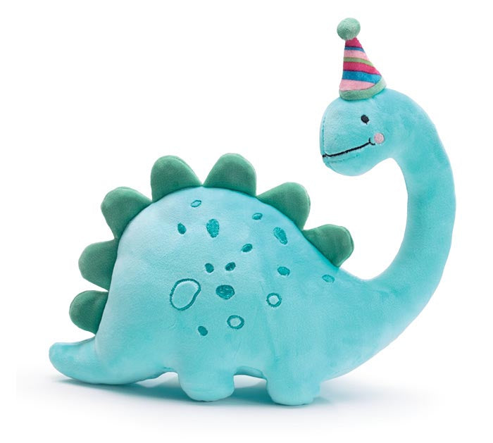 Plush teal dinosaur with a pointed party hat on his head. Has green spikes down the back with embroidered dots. Has embroidered facial features and an easy tie ribbon loop.