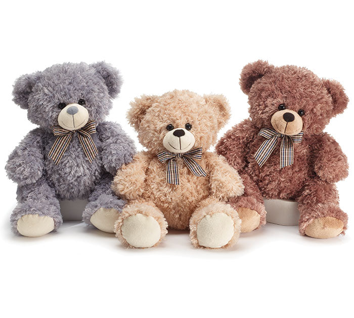 Assorted beige, grey, and brown plush bears with plaid blue, brown, and cream ribbon and easy tie ribbon loop.