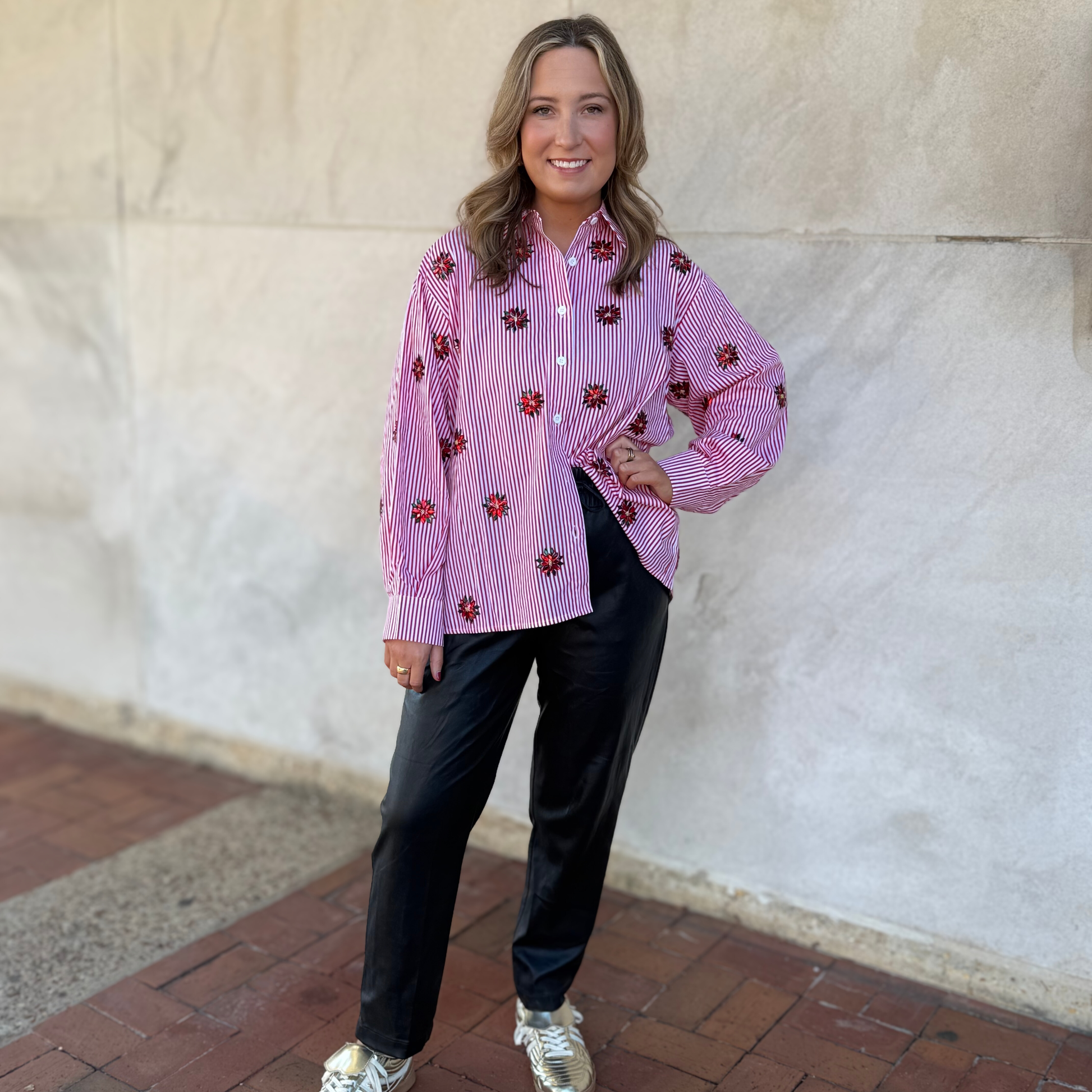 QOS Red & White Striped Poinsettia Button Up