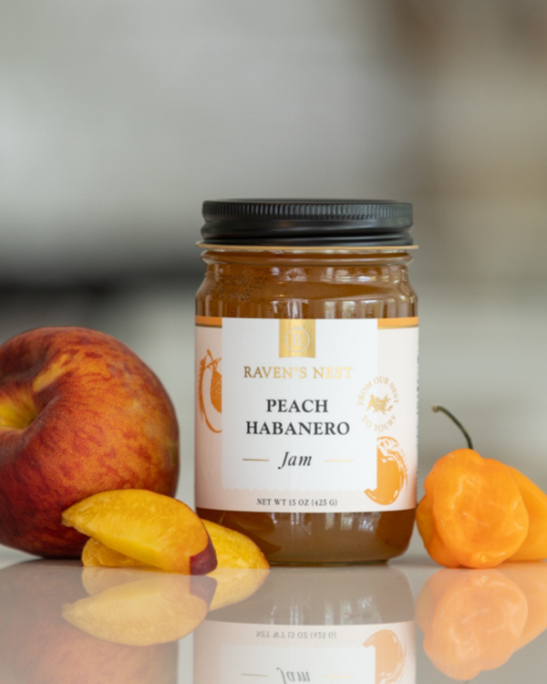 A milder version of Raven's Nest Hot Peach Jam, this Peach Habanero Jam is an unforgettable blend of peach sweetness and habanero heat. Made in small batches and simmered to perfection, it's simply delicious with goat cheese and crackers, on grilled pork chops, as a glaze for chicken wings, and in cocktails/mocktails!