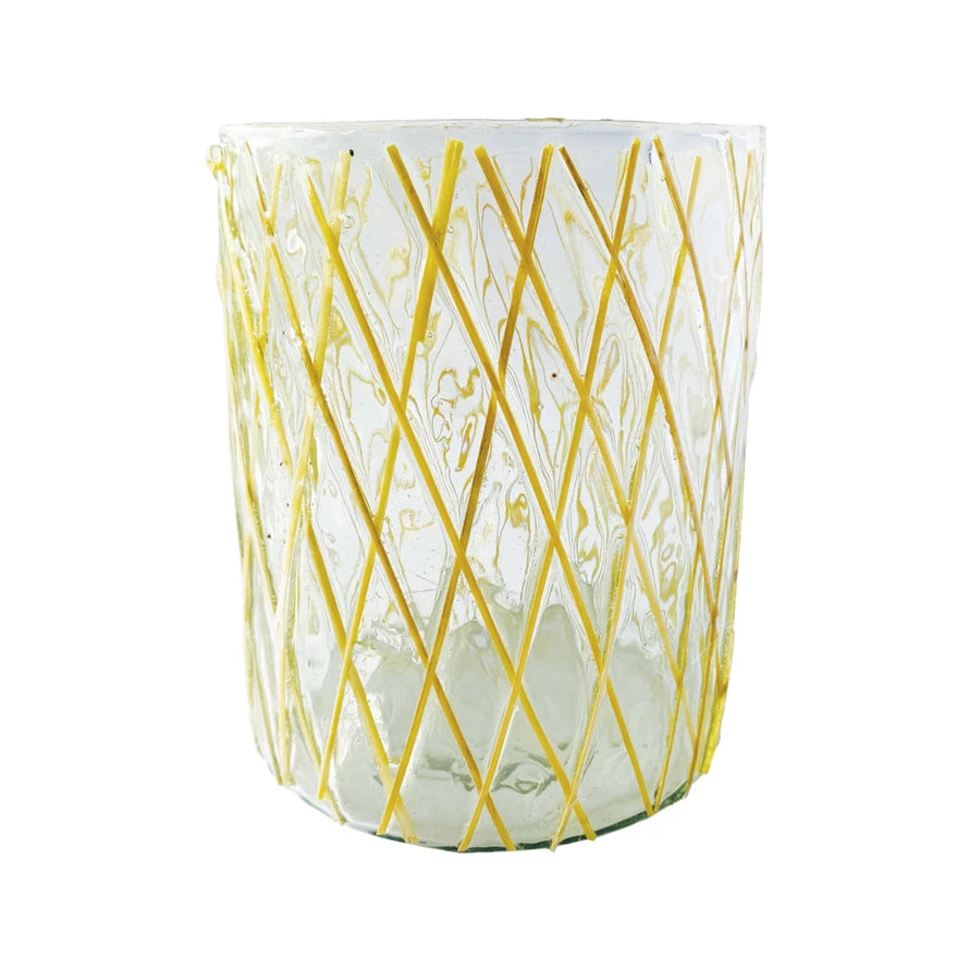 This rattan-wrapped glass candleholder is an exquisite blend of natural elegance and modern design. When illuminated, the clear glass cylinder's shimmering gold rattan pattern offers a stunning display of light and shadow. Measures 4.0 inches in diameter and 5.0 inches in height, perfectly sized to house favorite votive or tealight candles. Its dimensions ensure it is a versatile addition to any setting, while the high-quality materials guarantee a durable and attractive centerpiece. Whether lit to enliven a festive gathering or casting a warm glow on a quiet evening, this candleholder will enhance the experience with its unique character and charm. A captivating glass candleholder, adorned with a golden rattan pattern, marrying artisanal charm with a touch of luxury. A statement piece, this candleholder brings a sophisticated flair to any contemporary or bohemian-styled space. Ideal for creating an inviting atmosphere in the living room, bedroom, or dining area, enhancing the ambiance with its soft glow.