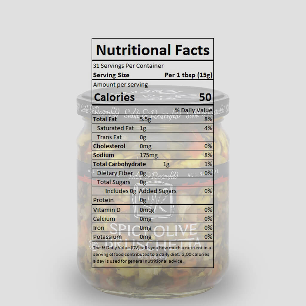 A blending of chopped kalamata olives, carrots, cauliflower, red bell peppers, celery, jalapeño peppers, capers, and Piri Piri peppers in olive oil. Spice up your favourite sandwich, pizza, salad, pasta, chicken or grilled fish.