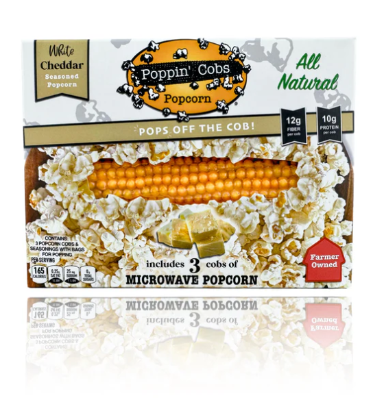 3 Poppin' Cobs individually wrapped. Comes packaged with 3 brown bag for popping. Instructions printed on label and 3 seasoning packets. Each Poppin' Cob makes roughly the equivalent to a traditional bag of microwave popcorn.