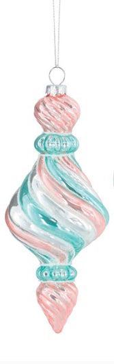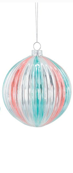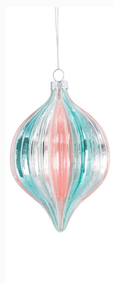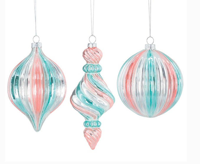 Hand-painted pressed glass ornament assortment. Ornaments have ridged stripes in pink and teal with white glitter in between each ridge in various shapes. Shapes are onion, finial, and round.
